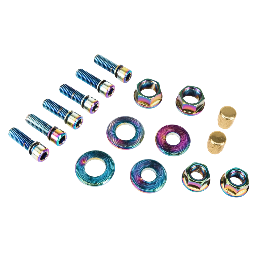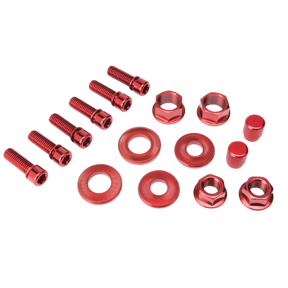 Mit dem Salt Nut And Bolt Set lässt sich dein BMX technisch wie optisch aufwerten. Das Set enthält alle wichtigen Schrauben und Muttern für Vorbau und Achsen und eignet sich ideal zum Austausch verschlissener oder optisch unpassender Originalteile. Die Kombination aus CrMo und Aluminium sorgt für eine ausgewogene Mischung aus Haltbarkeit und Gewicht. Durch die verschiedenen Farboptionen kann das Setup gezielt auf den restlichen Bike-Look abgestimmt werden. Neben den Vorbauschrauben sind auch Achsmuttern für unterschiedliche Achsstandards enthalten, wodurch das Set vielseitig einsetzbar ist. Abgerundet wird der Lieferumfang durch passende Aluminium-Ventilkappen, die den einheitlichen Look bis ins Detail fortführen.