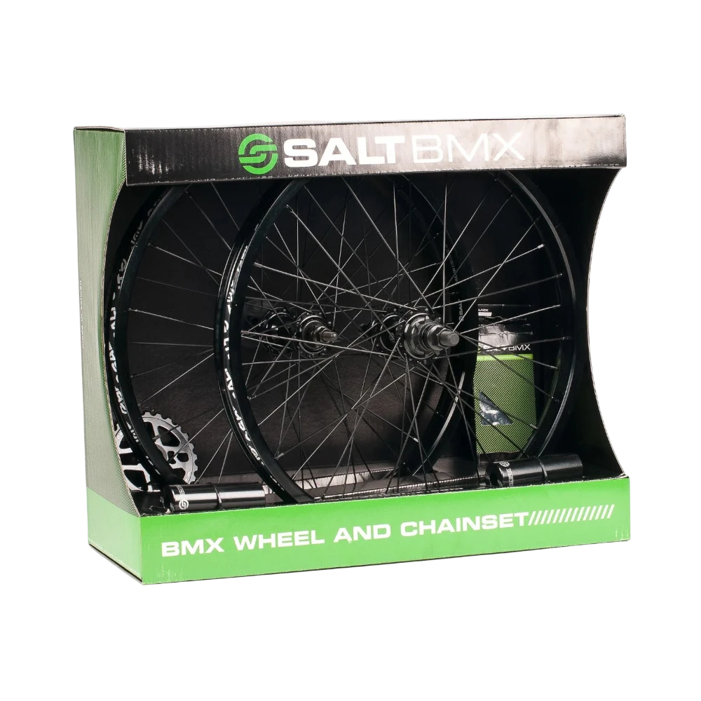 Komplettes BMX-Upgrade-Set mit Laufradsatz, 25T-Sprocket, Pegs und Kette. In Cyan oder Schwarz wählbar – stabil, stylisch und fahrbereit für 25-9-Übersetzung.